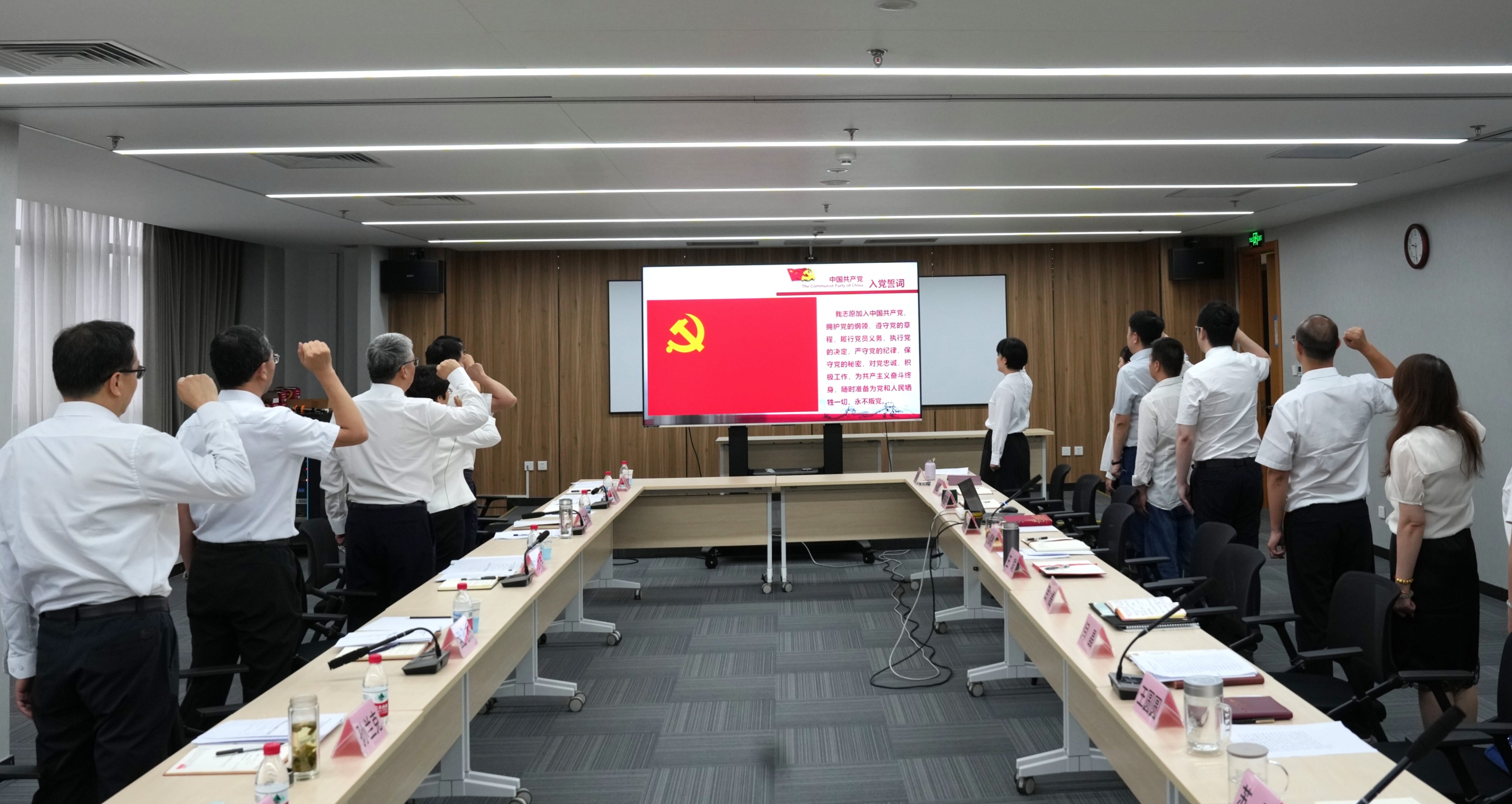 交流發言結束后,全體黨員在莊嚴的黨旗下重溫入黨誓詞。