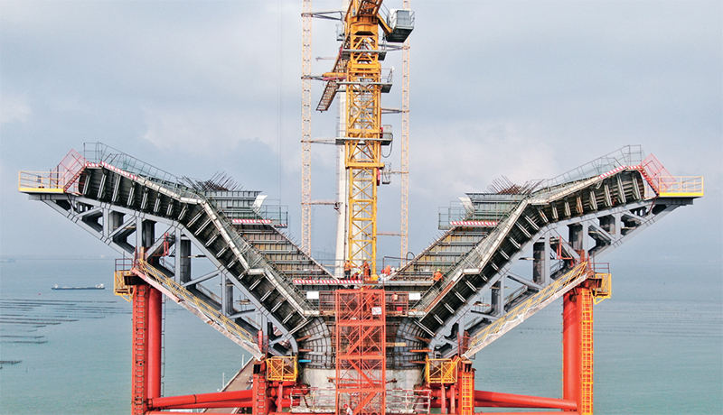 中央企業把主題教育與貫徹中央重大決策部署結合起來,切實抓好服務構建新發展格局戰略任務。黃茅海跨海通道是繼港珠澳大橋、深中通道之后,粵港澳大灣區又一跨海通道工程,由保利長大承建的黃茅海大橋中塔于2023年4月18日順利封頂。圖為4月17日,工人在黃茅??绾Mǖ傈S茅海大橋進行墩柱基樁建設。 新華社記者 鄧華/攝