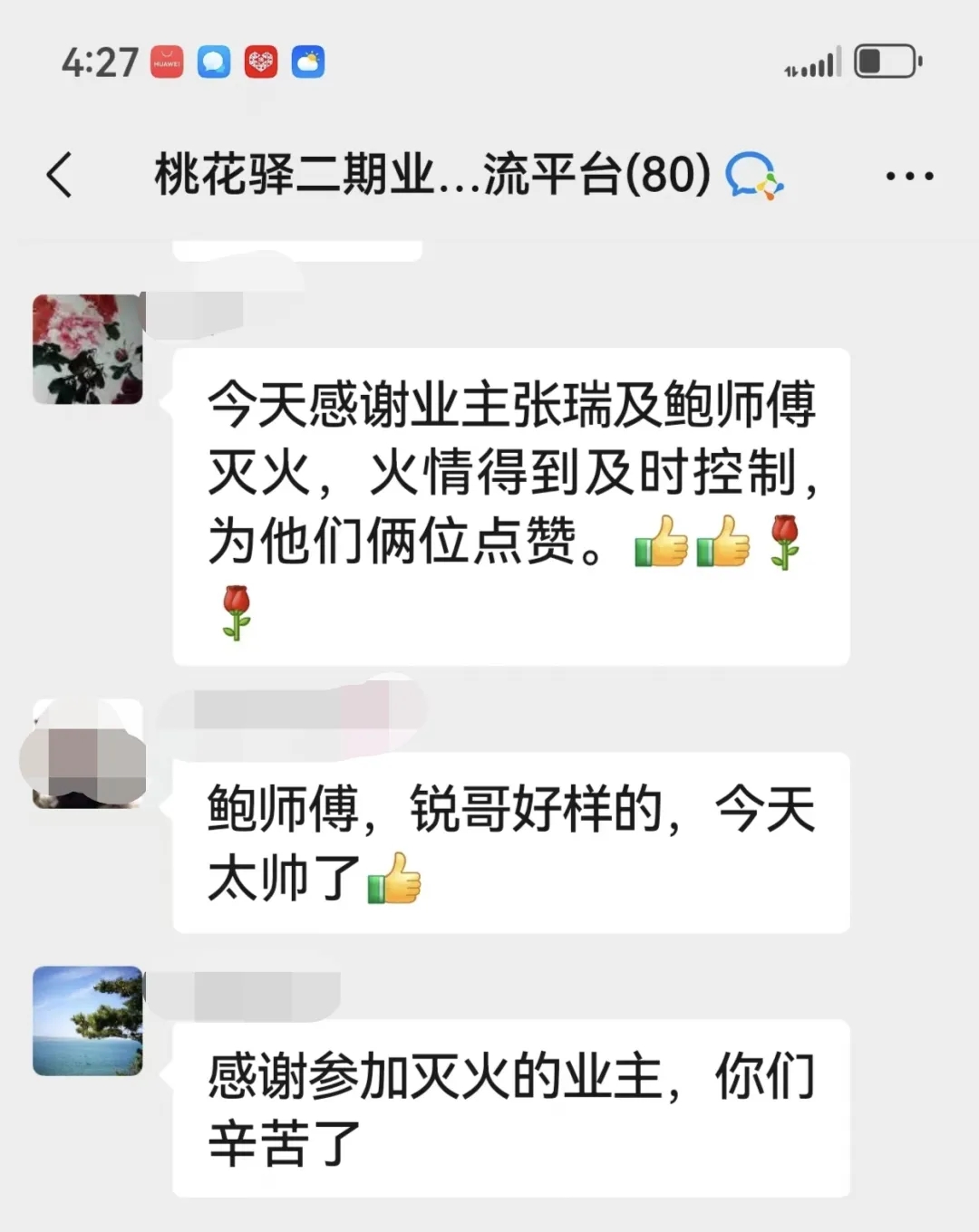 事后,同小區(qū)住戶將現(xiàn)場視頻發(fā)布到網(wǎng)上,鮑師傅和鄰居一起奮不顧身、守護鄰里的義舉被更多人知曉,小區(qū)業(yè)主們紛紛在群里為他們點贊。